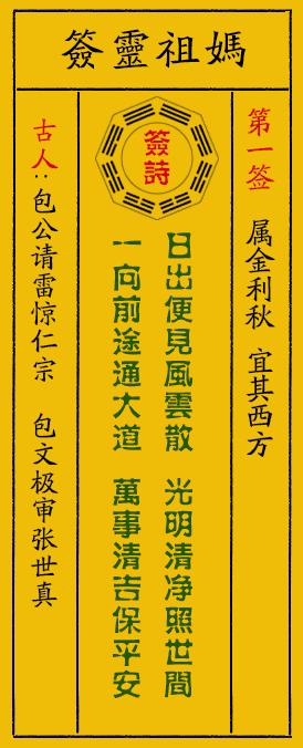 | 诗曰 | 日出便见风云散、光明清净照世间、一向前途通大道、万事清吉保平安。 |