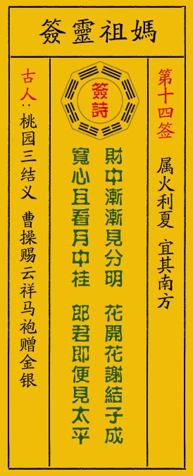 | 解曰 | 讨海:月光过大吉。 作塭:先微后有大利。 鱼苗:大利。 求财:月光渐进暗少。 耕作:早晚有收成。 经商:渐得。 月令:头破钱后如意。 六甲:先男后女。 婚姻:大吉。 家运:平安。 失物:月光在月暗无。 寻人:月中至。 远信:速至。 六畜:可当兴盛。 筑室:子孙永发其昌。 移居:不可。 坟墓:得其地后大吉。 出外:必得贵人。 行舟:下冬好。 凡事:允成。 治病:险月光过不畏。 作事:决意成功。 功名:破财后完明。 官事:可喜。 家事:光前裕后可喜。 求儿:平正。 |