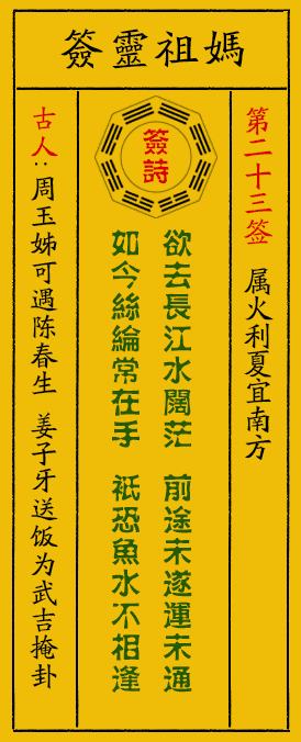 | 古人 | 【属火利夏宜南方】【周玉姊可遇陈春生】【姜子牙送饭为武吉掩卦】 |