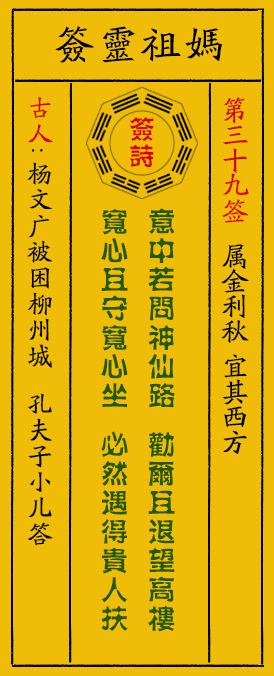 | 诗曰 | 意中若问神仙路、劝尔且退望高楼、宽心且守宽心坐、必然遇得贵人扶。 |