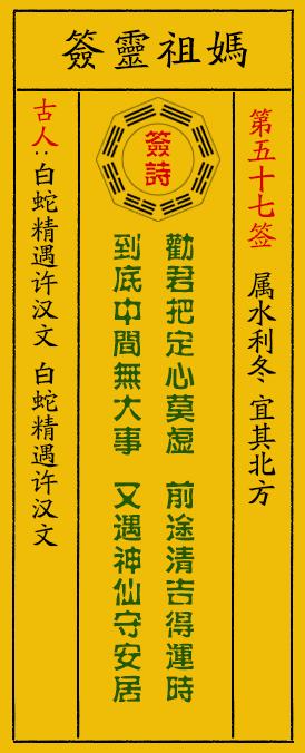| 解曰 | 讨海:有利入手。 作塭:有利可得。 鱼苗:有大利。 求财:应手而得。 耕作:平平有收。 经商:永发其财。 月令:破财平安。 六甲:弄璋喜庆。 婚姻:贵人扶大吉。 家运:神仙扶持平安。 失物:谨寻有。 寻人:只近回。 远信:且候佳音。 六畜:平平有财。 筑室:平安。 移居:平安。 坟墓:地运如意。 出外:遇贵人。 行舟:平平有财利。 凡事:把定心意。 治病:渐平安贵人扶。 作事:成好。 功名:应试必中。 官事:官欺凌明官判。 家事:且喜进益。 求儿:大吉。 |